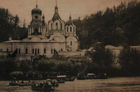 Оттуда они шествовали в церковь св. Николая, где были встречены о.Игуменом и братиею; во время пения тропаря св. Николаю Государыня молилась. Затем, проследовав в церковь св. Иоанна Предтечи и св. Алексия, человека Божия, изволили шествовать лестницею вниз, посетили келлии о. Игумена, от него парадною лестницею сошли к берегу Донца, где на приготовленной лодке изволили по Донцу отплыть к скиту при колокольном звоне и при восторженных кликах «ура» народа, стоявшего по обе стороны реки; Государыня изволила милостиво кланяться народу.