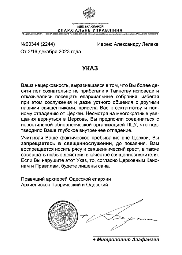Бывший настоятель храма Всех святых города Одессы протоиерей Дмитрий Матиенко, отказавшийся исполнять решение Собора УПЦ об отмене поминовения за Богослужениями имени Патриарха Московского и всея Руси Кирилла, заявил, что митрополит Одесский и Измаильский Агафангел написал на него заявление в СБУ. Более того, по словам священника, его лишили права настоятельства, передав храм Всех Святых другому священнослужителю епархии. Об этом он рассказал в интервью протоиерею РПЦ Георгию Максимову в передаче "Голоса несломленной УПЦ".