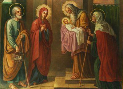 Господа храма, въ какомъ бы добровольномъ уничиженіи ни пришелъ Онъ, однако же, должно было встрѣтить достойнымъ образомъ. Кому же встрѣтить, какъ не служителямъ храма: священникамъ и первосвященникамъ? Но страшно подумать: храмъ стоялъ, блестящій мраморомъ и золотомъ, къ этому времени онъ въ особенности былъ разукрашенъ и благоустроенъ такъ, что возбуждалъ невольные удивленіе и восторгъ зрителей. Но благоустроителемъ этого великолѣпнаго храма былъ Иродъ, ищущій убить Богомладенца Іисуса. Богослуженіе въ храмѣ торжественно совершалось, священники считались тысячами; но среди нихъ уже дѣйствовала злоба врага, улш въ средѣ ихъ росли и крѣпли будущіе клеветники и убійцы Распятаго... Дѣло Божіе, однако, не могло остановиться за грѣхами людей... И вотъ являются здѣсь два избранника Божіи... и совершаютъ дѣло, предуказанное пророкомъ. Евангеліе не говоритъ, къ какому званію принадлелгалъ Сѵмеонъ. Большинство толкователей почитаютъ его священникомъ, другіе, на основаніи словъ евангельскихъ: бѣ человѣкъ въ Іерусалимѣ, признаютъ его лицомъ, не принадлежащимъ къ священному сословію. Но, умалчивая о званіи Сѵмеона, Евангеліе изобраліаетъ его великія нравственныя достоинства: «онъ былъ мужъ праведный и благочестивый, чающій утѣшенія израилева, и Духъ Святый былъ на немъ». Это, можно сказать, цѣлый рай нравственныхъ доблестей. Великая тайна божественной силы, которая въ нѣкоторыхъ великихъ избранникахъ ветхозавѣтной церкви, не нарушая законовъ природы и жизни человѣческой, могла, еще до появленія спасительной благодати Христовой, воспитать, соединить и утвердить столько нравственныхъ доблестей. Это удѣлъ, конечно, немногихъ: Энохъ, Илія, въ концѣ времени Іоаннъ Креститель Господень, вѣнецъ и краса всѣхъ – Преблагословенная Марія. Но при всемъ сіяніи свѣта въ душѣ и жизни ихъ, всѣ они глубоко сознавали и чувствовали нужду въ искупленіи и спасеніи. Азъ требую тобою креститися, говоритъ Іоаннъ пришедшему къ нему Іисусу (Мѳ. 3, 14). Беличитъ душа моя Господа и возрадовася духъ мой о Бозѣ Спасѣ моемъ, поетъ Приснодѣва Марія (Лук. 1, 47). Къ числу сихъ избранниковъ Божіихъ должно отнести и праведнаго старца Сѵмеона. Въ духовномъ просвѣщеніи относительно тайны Искупленія онъ наравнѣ съ Пречистою Приснодѣвой и Крестителемъ Іоанномъ поднимается надъ всѣми современниками и силою Духа проникаетъ въ тайну Креста Господня, до чего не могли возвыситься самые избранные изъ апостоловъ. Но столь высокому духовному озаренію долженъ предшествовать долгій путь постепеннаго и ревностнаго усовершенія въ подвигахъ благочестія. Въ награду за труды и подвиги праведнаго Сѵмеона, въ исполненіе той вѣры, которая проникла всю его жизнь, въ удовлетвореніе живѣйшей его надежды, въ насыщеніе его душевной жажды – ему было обѣщано, что онъ не умретъ, пока не увидитъ Іисуса своими собственными глазами... Можно представить, чѣмъ сдѣлалась теперь эта догорающая жизнь для Сѵмеона. Каждое утро сердце его вопрошало: не нынѣ ли будетъ мнѣ эта радость... Каждый вечеръ освѣщалъ онъ тою же радостною надеждою – видѣть заутра Спасителя міра... И вотъ въ одинъ день слышитъ онъ внушеніе Духа: иди въ церковь! Какою радостію забилось старческое сердце при этой вѣсти... Съ живостью пылкаго юноши спѣшитъ онъ въ храмъ, ждетъ и наконецъ пріемлетъ на свои руки Того, для Кого жилъ, въ Кого в