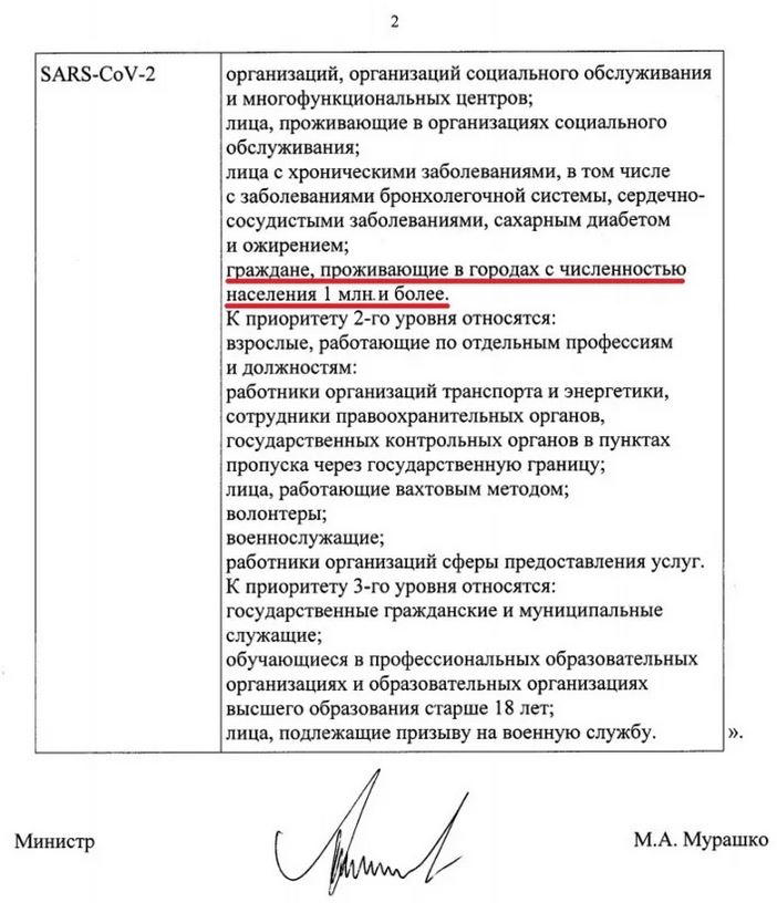 Примечательно, что Приказом Министерства здравоохранения РФ от 03.02.2021 N 47н «О внесении изменения в календарь профилактических прививок по эпидемическим показаниям» к работникам медицинских, образовательных организаций и организаций соцобслуживания добавили всех горожан крупных городов: «Граждане, проживающие в городах с численностью населения 1 млн. и более».