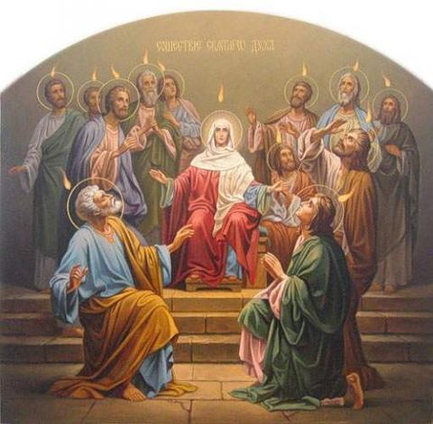В Евангелии повествуется, что апостолы молились единодушно в горнице на горе Сион, как вдруг, в третьем часу дня, что соответствует девятому часу утра по нашему времени, сделался великий шум с неба как бы от сильного ветра, и Дух Святый, в виде огненных языков, низшел на каждого из молящихся; все они исполнились Божественною силою и мудростью; все вдруг получили великий дар свыше – знание языков, что должно было облегчить им благовествование всем народам.
