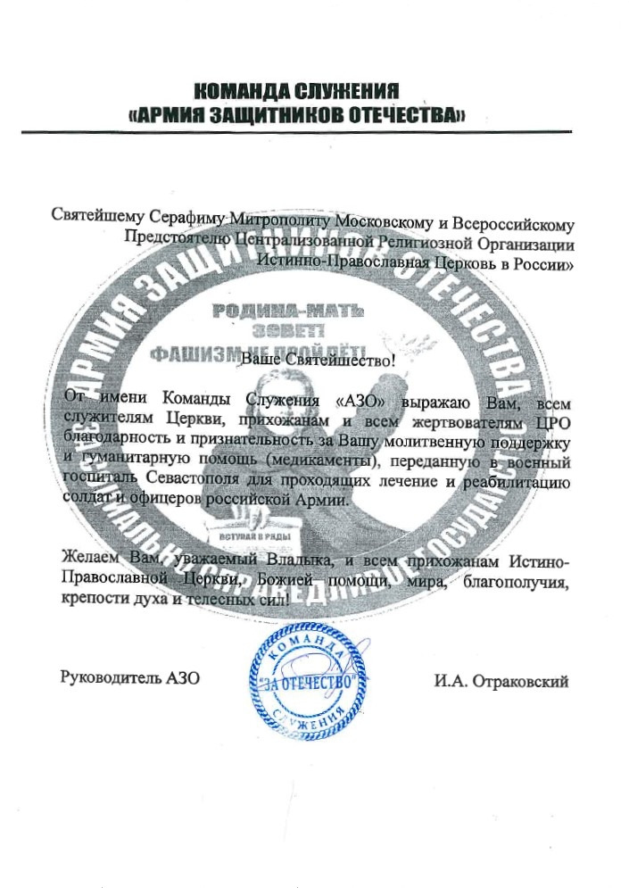 Помимо неустанной молитвенной поддержки и духовного окормления воинов Российской Армии священниками-капелланами ИПЦ на передовой, по благословению Предстоятеля, святейшего Серафима, митрополита Московского и Всероссийского, Церковь регулярно оказывает гуманитарную помощь солдатам и офицерам РА, проходящим лечение и реабилитацию в госпиталях на территории Российской Федерации. В частности, была закуплена и передана в военный госпиталь г. Севастополя партия необходимых лекарств и медикаментов.