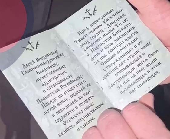 В розданных на днях российскими священнослужителями российским же солдатам "молитвословах оккупанта", вверху изображён Голгофский крест, а с двух сторон от него, вместо традиционных копья и губы с уксусом, в качестве орудия пыток Спасителя изображены два автомата калашникова, символически изображающие убийц Христа, под видом принадлежащих этим убийцам смертоносного оружия.