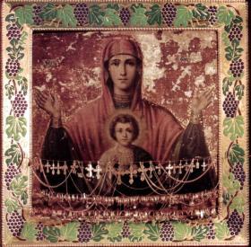 По промыслу Господню брошенную икону обнаружил житель станицы и, очистив ее, в 1993 году принес в храм. Удивительно, что куры, клевавшие зерна с иконы, не тронули ни святых ликов, ни одежд, а над плечами Пресвятой Богородицы, воздевшей руки над своим Сыном и Богом, по всему золотому фону были выклееваны маленькие крестики.